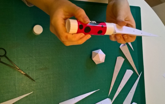 Du skal i alt klippe, folde og lime 20 stjernetakker. Når du har gjort det, så skal de limes på stjernens kerne. Du skal putte lim på de tre små felter i stjernetakkens ende.