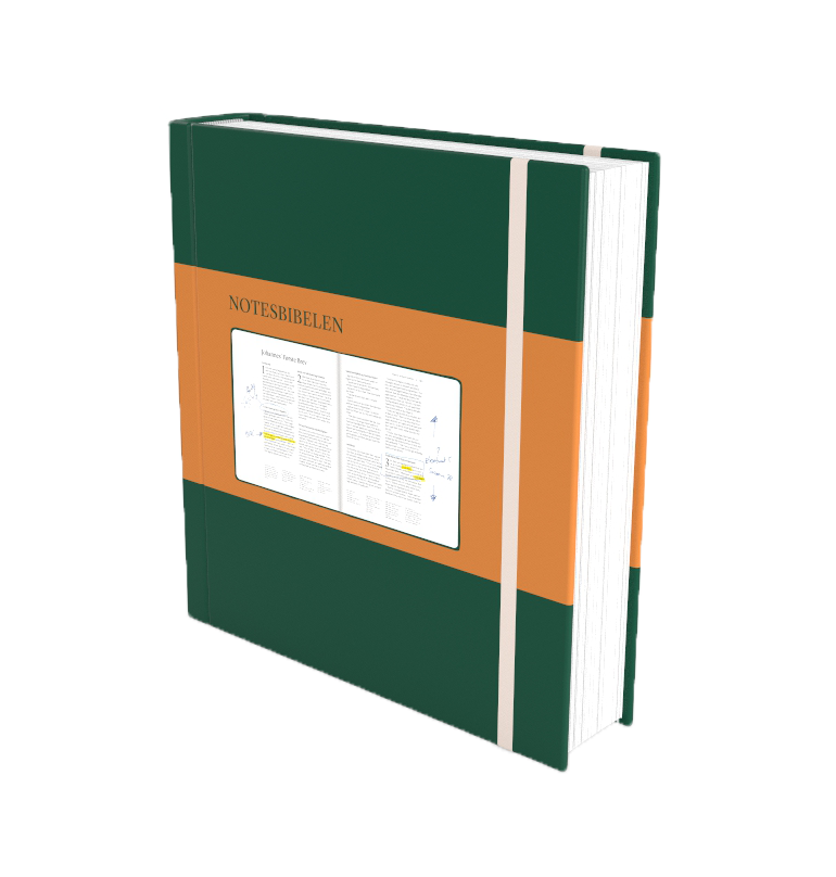Notesbibelen er bibel og notesbog i ét. Den har god plads i margin og kan for eksempel bruges til kommentarer, studienotater, fremhævninger, spørgsmål, bønner eller tegninger.