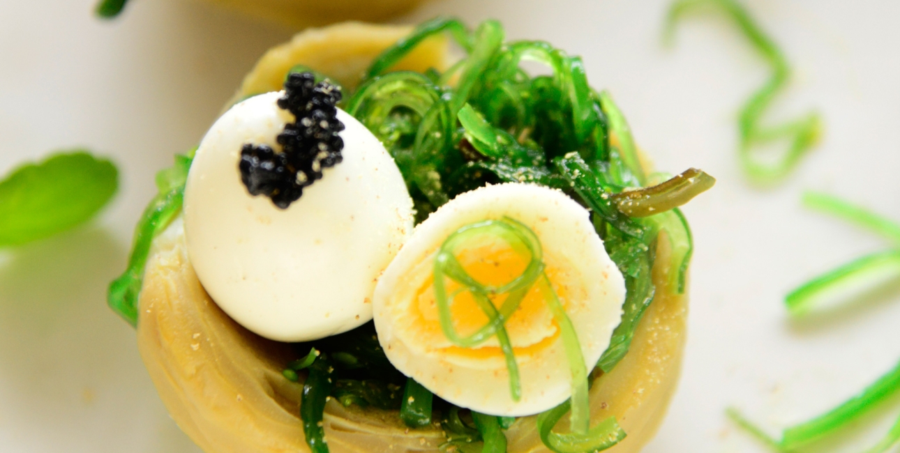 Denne lille frokostret er sammensat af artiskokbunde, tang og vagtelæg. På toppen er den lækre “kaviar” af tang.